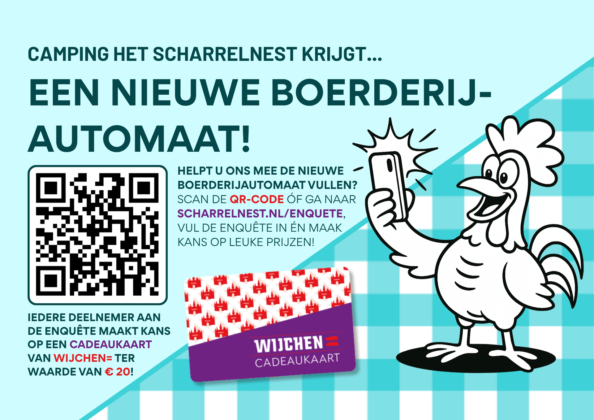 Het leuke aan deze nieuwe ‘Zelfservice boerderijwinkel’ is dat inwoners van Wijchen zelf bepalen welke producten er in de automaat komen te liggen. En al helemaal leuk: als je ’t Scharrelnest helpt, steun je dus ook leerlingen van het Maaswaal College Veenseweg met hun onderzoek voor het nieuwe schoolvak Havo-P. Én misschien nog leuker: wie de enquête invult, maakt kans op een waardebon van Wijchen= ter waarde van €20. Een echte win-win-win dus!